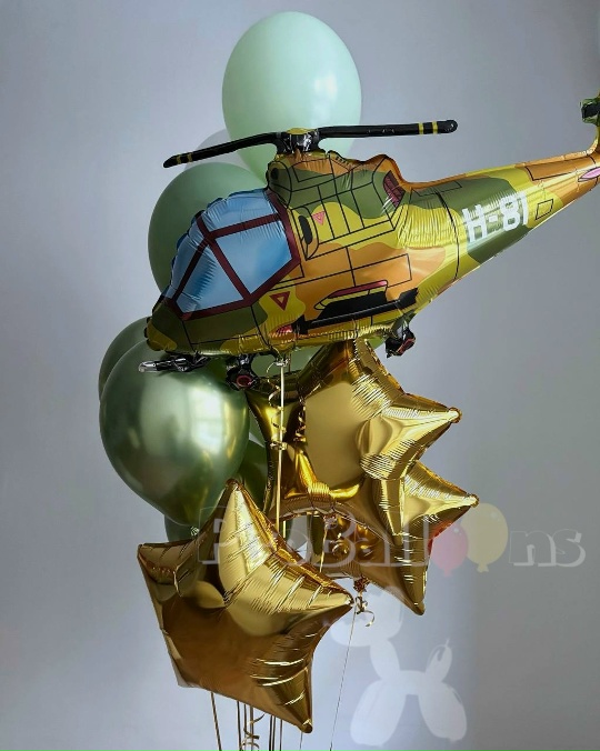 -фонтанчик из 5 шаров оттенка пастель, 3 шара хром, 3 звезды, 1 фигура вертолёта