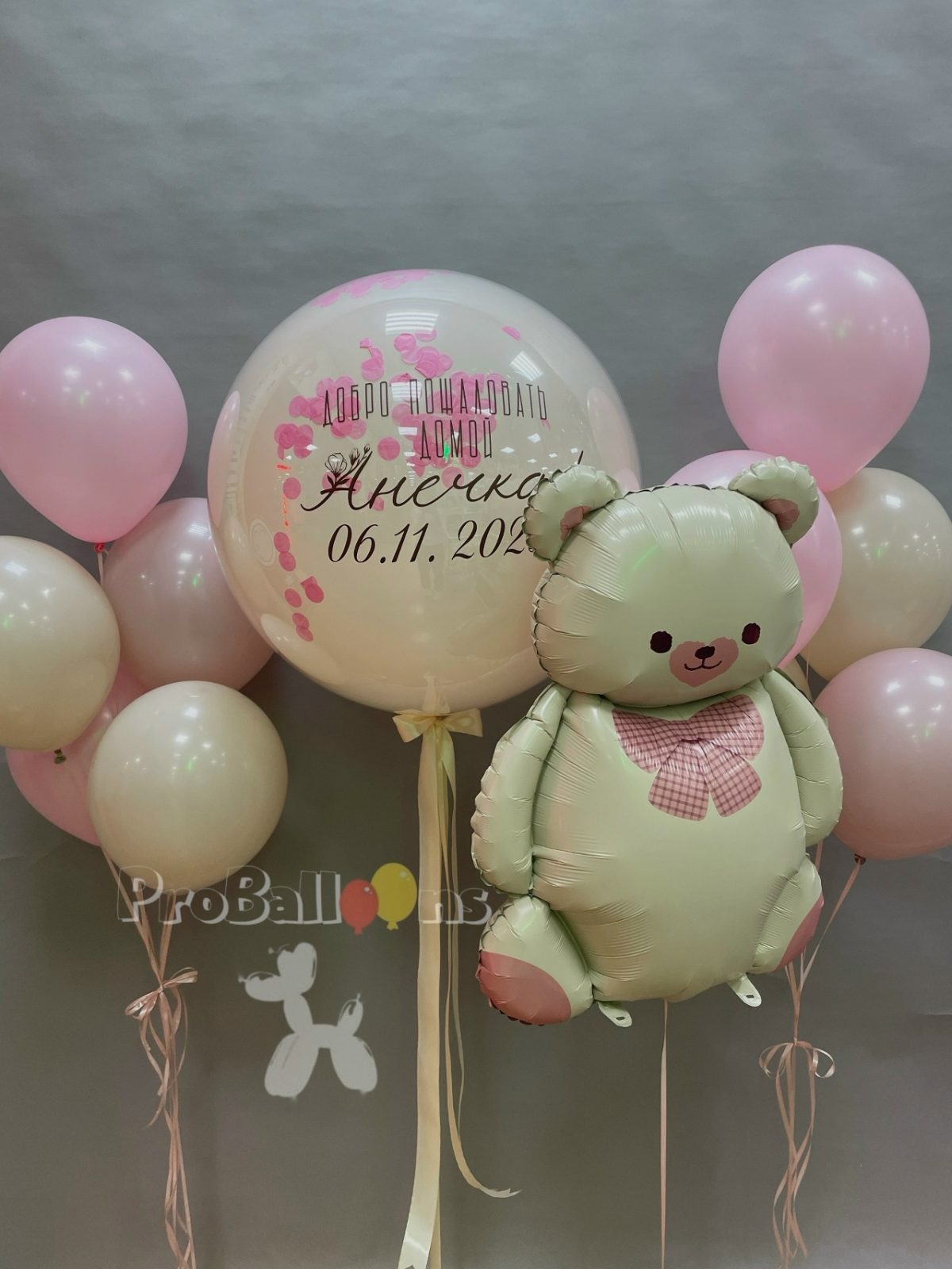 Шарики на выписку порадуют маму и создадут атмосферу ☺️🎈 В набор входит : -1 фольгированный мишка на грузике -2 фонтанчика по 5 Шаров оттенка пастель -зеркальный гигант с индивидуальной надписью и декором в виде конфетти Даем гарантию на полёт гелиевых шаров от 3 дней, как правило шарики летают намного дольше 😃 Так же у нас работает доставка по городу и области. Количество и цвет шаров можно изменить по вашему желанию 🤗