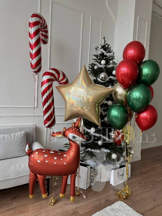 Шарики порадуют на Новый год, создадут атмосферу праздника😀🎈 В набор входит: -фонтанчик из 10 Шаров оттенка хром -1 большая голографическая звезда с индивидуальной надписью -1 олененок на грузике -2 фольгирлванные трости на грузиках Даем гарантию на полёт гелиевых шаров от 3 дней, как правило шарики летают намного дольше😀 Так же у нас работает доставка по городу и области. Количество и цвет Шаров можно изменить при желании😁