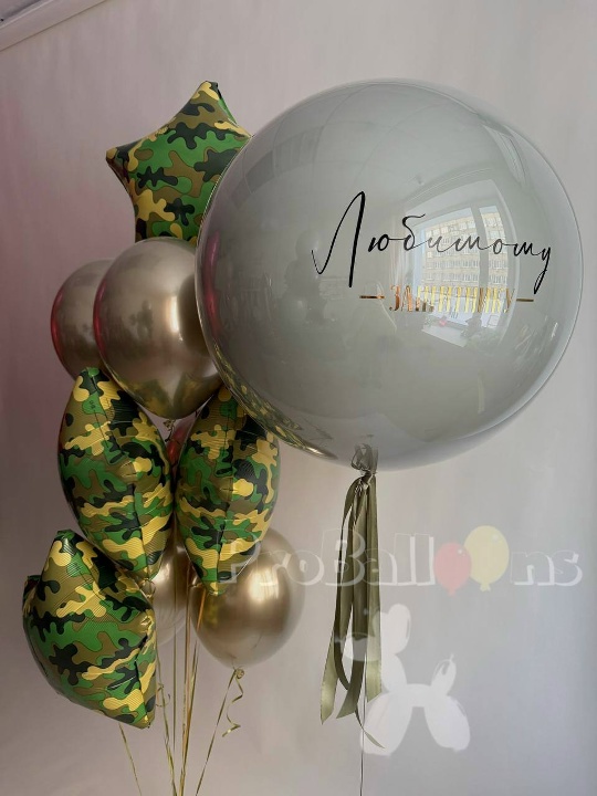 -фонтанчик из 10 шаров ( 4 фольгированных камуфляжных звезды, 6 шаров хром)